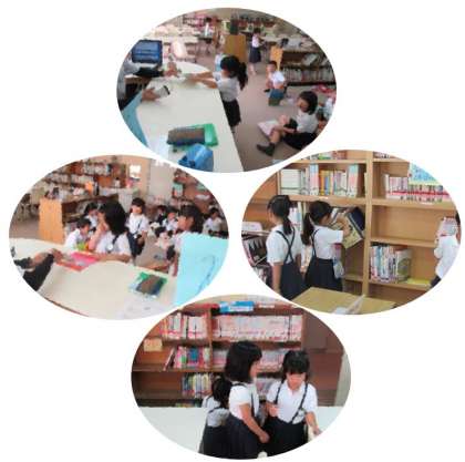 1年生が図書室で学習しています。借りていた本を返し、新しく本を借りました。本棚の倒れている本も、整理しています。
