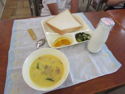 本日の給食の献立をご紹介します。本日の献立は、食パン、はちみつ、かぼちゃのクリームシチュー、ミックス海藻のサラダ、オレンジ、牛乳でした。