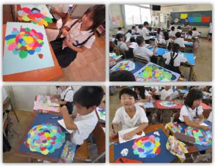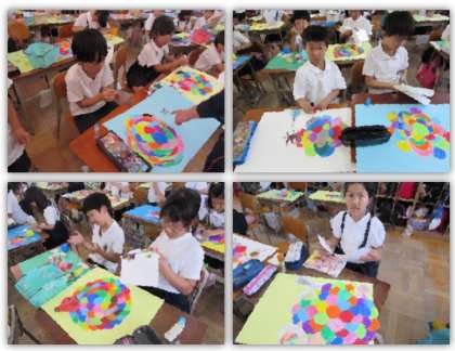 3年生の学習の様子をご紹介します。パスで塗りつぶして花を作り、その周りに、虫やカエルなどを描いて、貼りつけていきました。
