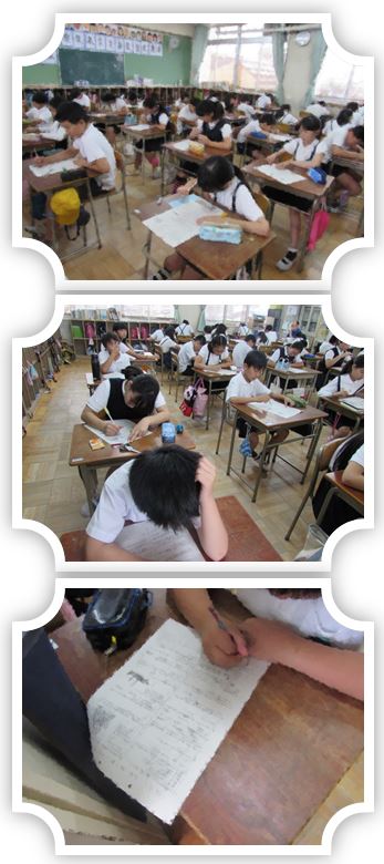 6年生の学習の様子をご紹介します。1組は、社会科のテストをしています。テストを見てみると、「十七条の憲法」「大仏」といった言葉が見られます。集中して、頑張る6年生たちです。