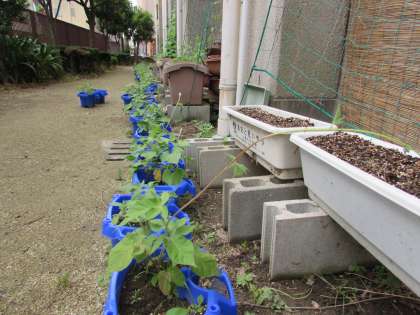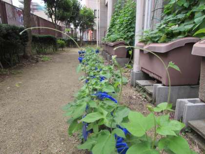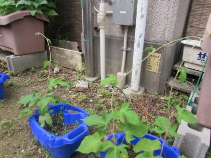 1年生のアサガオです。本葉もどんどん増えています。今日見てみると、つるがぐんぐん伸びて、空中に手を伸ばしているかのようです。そろそろ支柱が必要なようです。