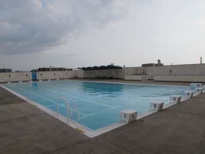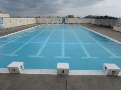 プール清掃を終え、きれいになったプールは静かに水をたたえ、明日のプール開きを待っています。