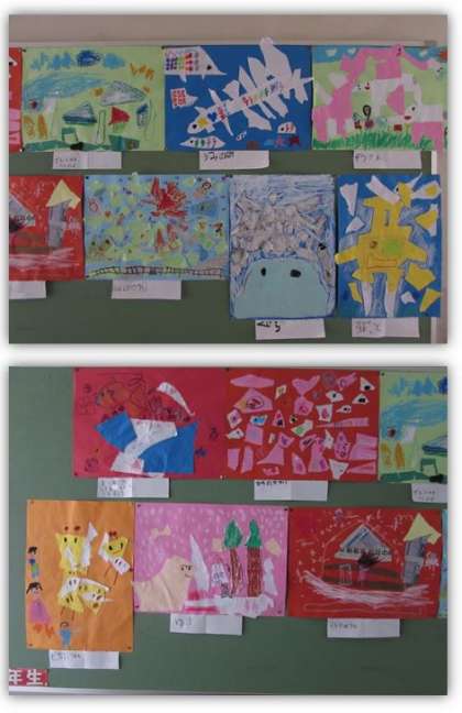 1年生の作品をご紹介します。図画工作の作品「やぶいたかたちからうまれたよ」です。色画用紙や和紙、新聞紙を自由に手でちぎり、そのちぎった形が何に見えるか考えて、作品にしました。子どもたちは、動物やロボット、飛行機やゲームのキャラクターなど、さまざまな世界を想像していきました。
