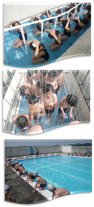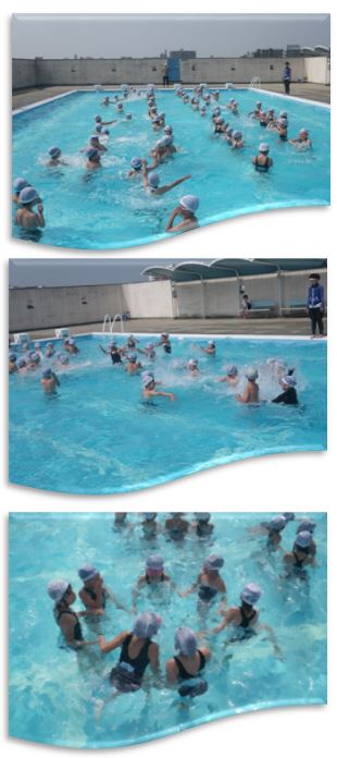 1時間目は、3年生です。プールの中で、水のかけ合いをしたり、友だちと手をつないで水に浮かんだりしました。