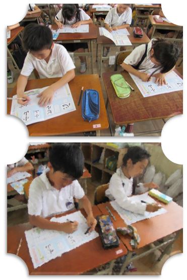 3年生の学習の様子をご紹介します。国語の硬筆書写の学習です。鉛筆とフェルトペンで、ていねいに書いていきました。