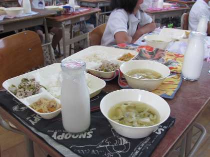 本日の給食の献立をご紹介します。本日の献立は、ご飯、豚肉の梅風味焼き、すまし汁、切り干し大根の炒め煮、牛乳でした。