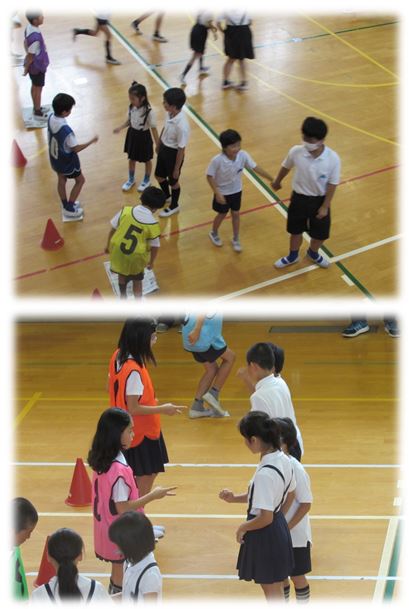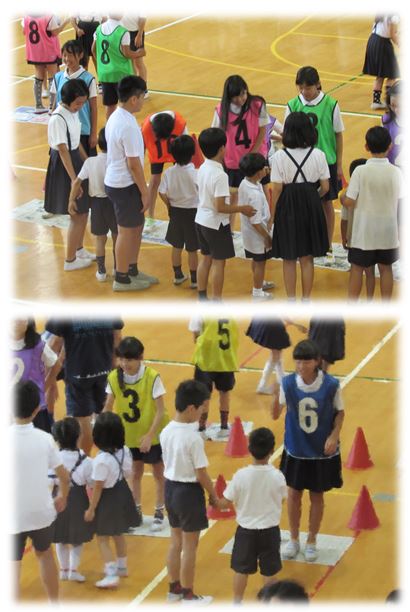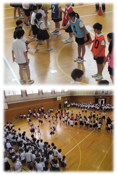 木曜日の朝、児童集会の様子をご紹介します。今日の児童集会は、「新聞じゃんけん」を行いました。新聞紙の上に立つ自分たちの班のリーダーと、じゃんけんをします。じゃんけんに勝ったら、リーダーが乗っている新聞紙を半分に折ります。リーダーが立てなくなるまでに新聞紙が小さくなったチームが勝ちです。