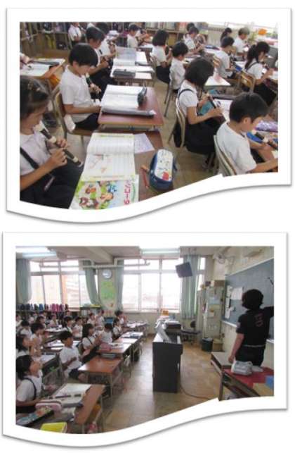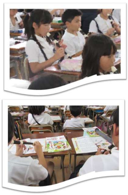 3年生の学習の様子をご紹介します。2組が音楽の学習で、リコーダーの練習をしています。今日は、高い「レ」の音を出して、「坂道」「雨上がり』「かりかりわたれ」などを吹きました。
