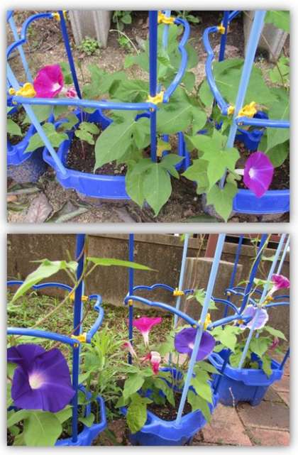 1年生の育てているあさがおです。今日も、色とりどりの花が、たくさん咲いています。