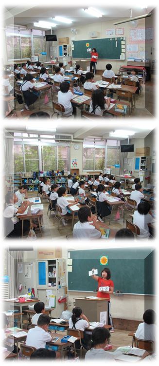 1年生の学習の様子です。担任の先生が前でカードを出し、それを子どもたちが答えています。今日は、10までの数のひき算の学習をしています。「10ひく3は?」「7!」「10ひく5は?」「5!」子どもたちは、カードが出ると、すぐに答えていきました。