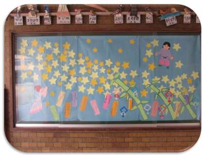 7月の玄関掲示は、6年生の作品です。星の河と、短冊が並んでいます。短冊には、6年生の子どもたちの願いが書かれています。