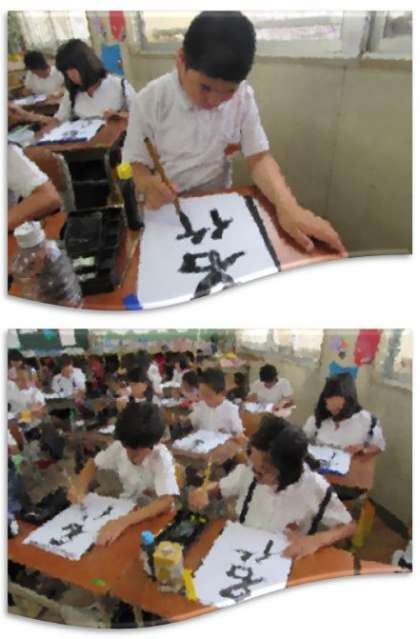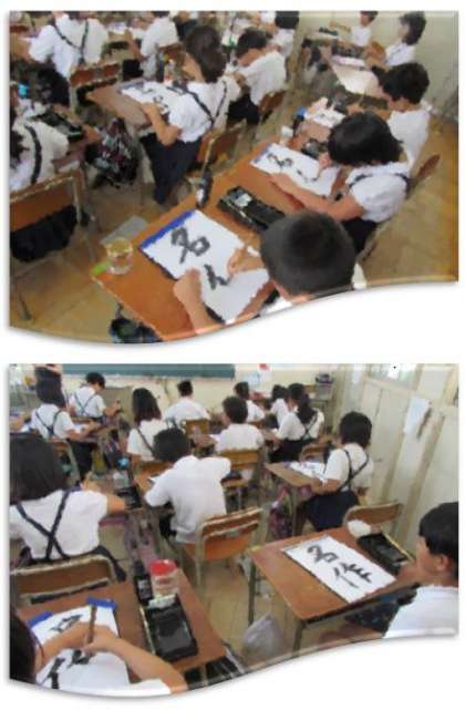 4年生の毛筆書写の学習の様子です。今日は、「名作」と書きました。はらいやとめを意識して、書いていきました。
