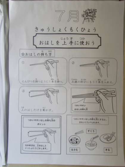 7月4日(月) 7月の給食のめあてをご紹介します。7月のめあては、「おはしを上手に使おう」です。