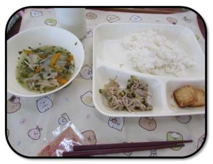 本日の給食に献立をご紹介します。本日の献立は、ご飯、ゴーヤチャンプルー、五目汁、厚揚げの生姜醤油がけ、牛乳でした。