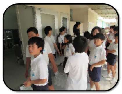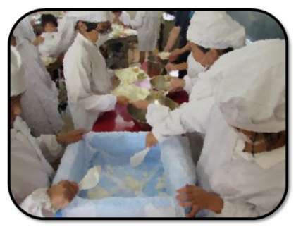画像中は、当番の準備の様子、画像下は給食を終えて、当番が食器や食缶を給食室に返しにきたところです。