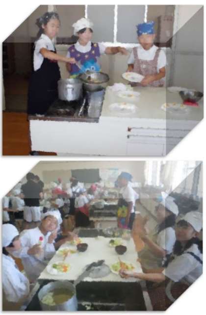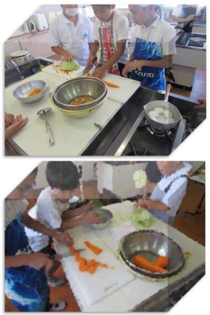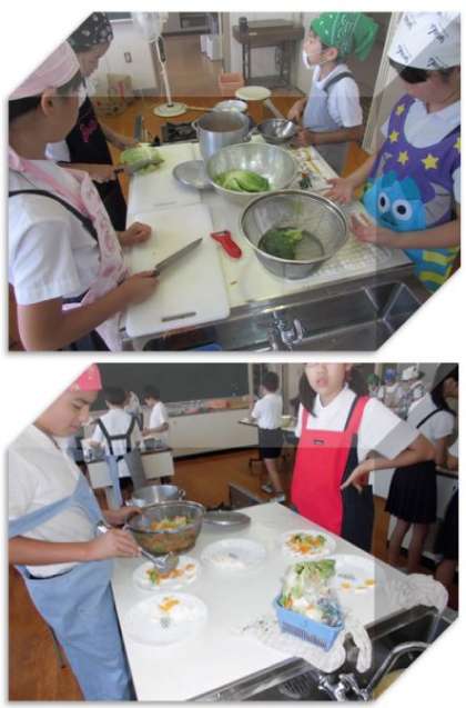 5年生の学習の様子をご紹介します。今日は家庭科の調理実習で、ゆで野菜とゆで玉子を作りました。ガスコンロの使い方、包丁の使い方などを確認し、安全で、衛生的で、おいしい調理を目標に取り組みました。