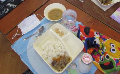本日の給食の献立をご紹介します。本日の献立は、牛丼、冬瓜のみそ汁、大福豆の煮物、牛乳でした。