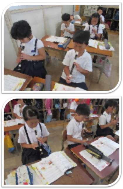 3年2組の音楽の学習の様子です。初めに、音符や休符、階名などについて、プリントで学習をしました。その後、リコーダーの2部合奏にチャレンジしました。「そよ風」という曲です。2つのパートの音が重なった時、思わず「すごい!」という声が上がりました。