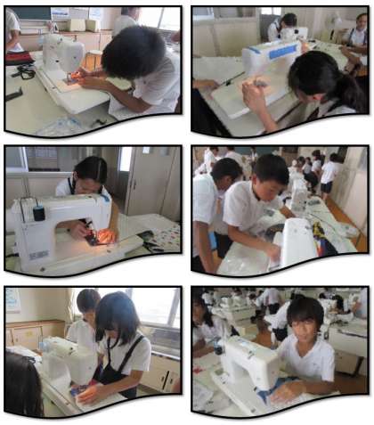 5年生の家庭科の学習の様子です。家庭科室で、ミシンを使って、ナップザックを作っています。出来上がったナップザックは、29日からの林間学習に持っていく予定です。