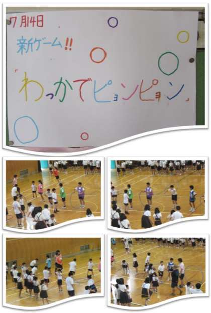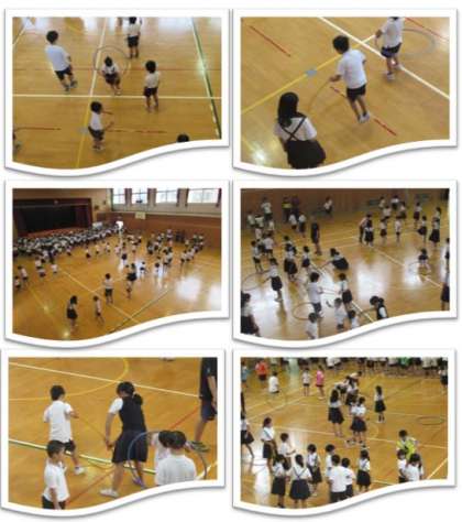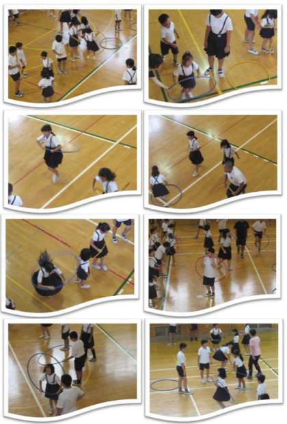 木曜日の朝、児童集会の様子をご紹介します。今日の集会は「わっかでピョンピョン」です。中央に置かれた輪のところで、3回ずつ跳んで、次のペアと交代します。時間内に、どれだけの人数が跳べるか、競いました。