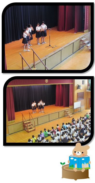 ゲームの後、図書委員会からの連絡がありました。先日、集めた読書ノートで、各クラスでいちばん多く本を読んでいた子が紹介されました。中には、この1学期だけで200冊以上も読んでいる子もいるそうです。夏休みにも、たくさんの本に出会えるといいですね。
