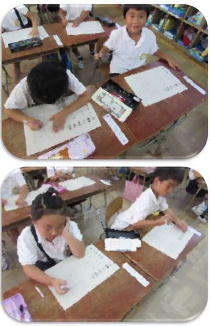 お昼休みが終わって、5時間目が始まる前の5分間、帯タイムです。1年生も、プリントで学習をしています。