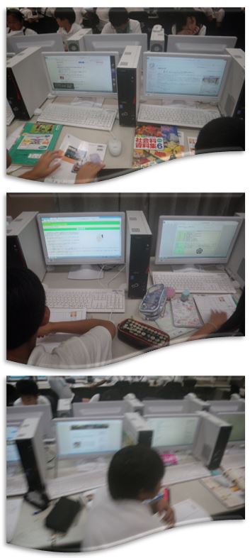 6年生の社会科の学習です。パソコン室に行き、社会科の歴史新聞を作るための材料をさがしました。新聞の題材は、1学期に学習したことがらから各自が選びました。