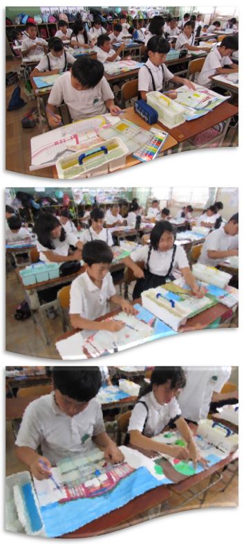 図画工作では、写生した生根神社の絵に、絵の具で彩色をしています。空を塗り、本殿をどのように表現するか、思案しています。