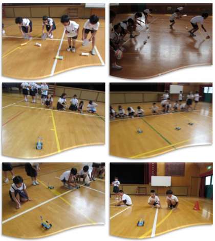 3年生は理科で、風やゴムの力について学習しました。今日は、体育館に行き、作ったかざわ(紙コップを2つつなげたもの)や自動車を走らせてみました。自動車は、ゴムを巻いてそれを動力とするのですが、巻きが足りなくても、また、巻き過ぎても自動車は走らず、子どもたちは何度も何度も試していました。そして、自分の自動車がびゅん!と走った時は、とっても嬉しそうな表情をしていました。