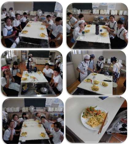 今日は、6年1組が調理実習を行いました。1組の子どもたちも、朝食に合うおかずを考え、作りました。朝の時間にできるものを、栄養のバランス、調理にかかる時間、予算を考えて、作りました。