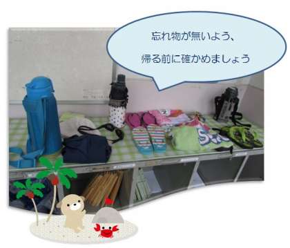 プールの更衣室にたくさんの忘れ物がありました。 忘れ物は、職員室前に置いてあります。