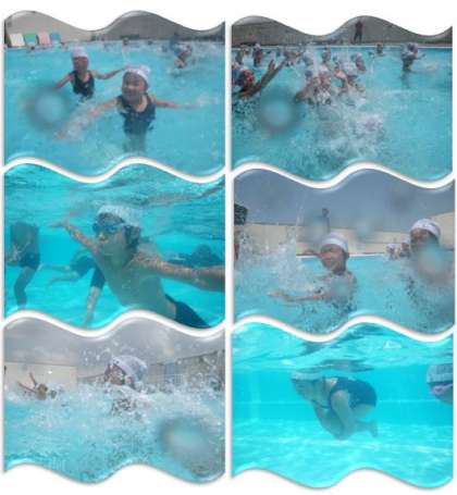 1・2年生のプール開放の様子です。水慣れをし、水遊びを楽しみました。ビート板を使って、バタ足の練習もしました。