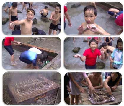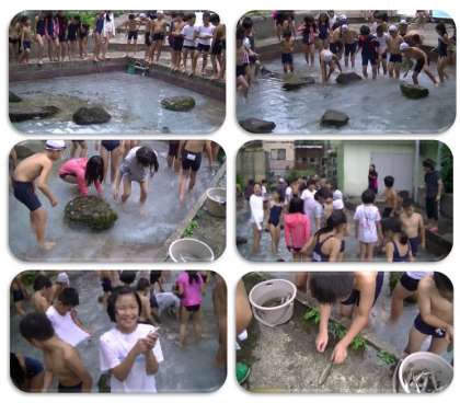 昼食の後、初めの活動は「魚つかみ」「ウォータースライダー」です。クラスごとに、交代で行いました。
