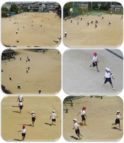 1年生の体育の学習の様子をご紹介します。今日も運動場いっぱいに広がって、元気いっぱい、走っています。「バナナおに」や、かけっこの練習をしました。