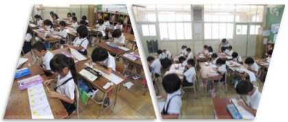 1年生の学習の様子をご紹介します。国語で、漢字ドリルを使い、新出漢字の練習をしています。1画ずつ、ていねいに書いています。