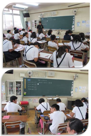6年生の算数の学習の様子をご紹介します。算数では、「比と比の値」の学習です。等しい比の関係について調べ、その考え方を使って、小数対小数、分数対分数の比を、簡単な整数の比の形にする方法を考えています。