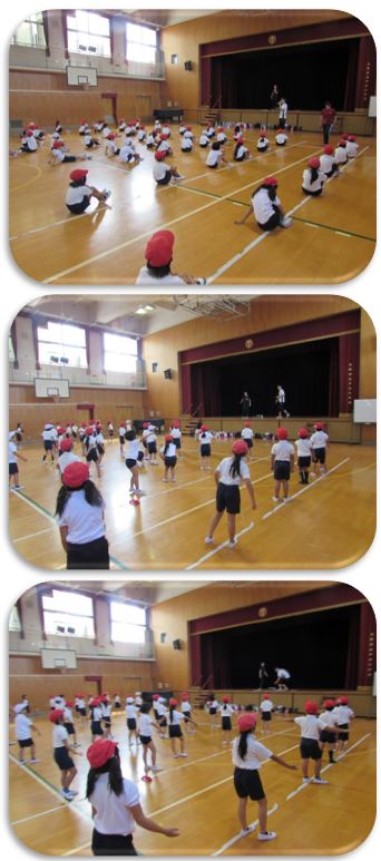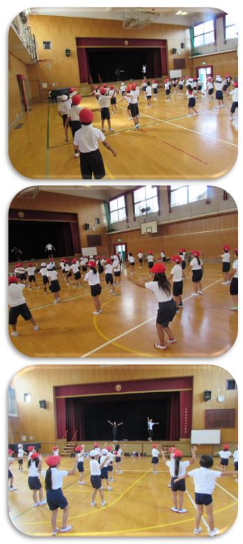 2年生の学習の様子をご紹介します。1時間目、体育館で、運動会のダンスの練習をしました。前で踊る先生をお手本に、楽しく体を動かしています。