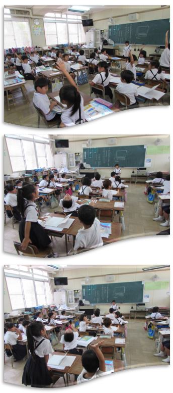 1年生の学習の様子です。国語の学習「はなしたいな、ききたいな」で、夏休みの思い出を描き、それを発表しました。聞いている子どもたちは、その内容について、質問をしています。