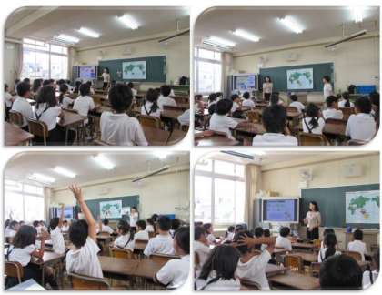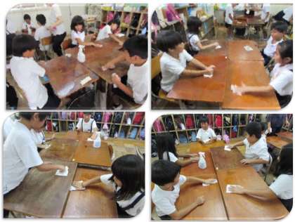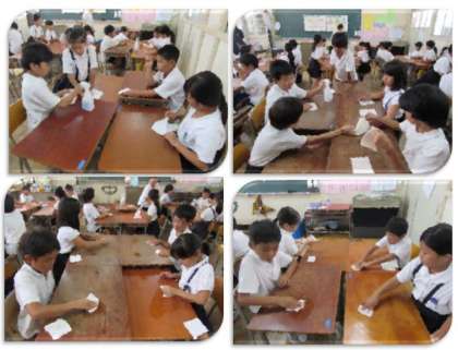 本日の5・6時間目、株式会社岡村製作所から2人の講師の方にお越しいただき3年生の出前授業を行いました。初めに電子黒板ルームで、毎日使っている机やいすがどのように作られているのか、ということや、3R(リデュース・リユース・リサイクル)について教えていただきました。その後、自分たちの教室に戻り、自分たちの机やいすを実際に磨いてみました。「電界アルカリ洗浄水」で拭いていくと、普段掃除をしているつもりの机やいすが、随分と汚れていることに気づきました。本日の学習を通して、自分の机やいすを大切に使おうという気持ちが育ったことと思います。