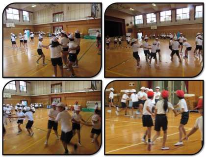 4年生は、初めに体ほぐしの運動を行ってます。手をつないで走り、体があたたまってきました。