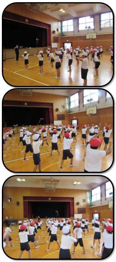 3年生は、体育館で団体演技の練習を始めました。テンポが速く、踊っていると笑顔がはじけ、汗をたっぷりかきました。