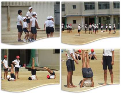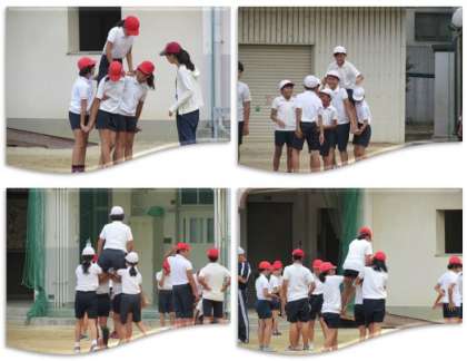 6年生は運動場で、騎馬戦と組み立て体操の練習を行いました。騎馬をどのように組むのか考え、また、組み立て体操では運動場で寝転んで技の練習に取り組みました。