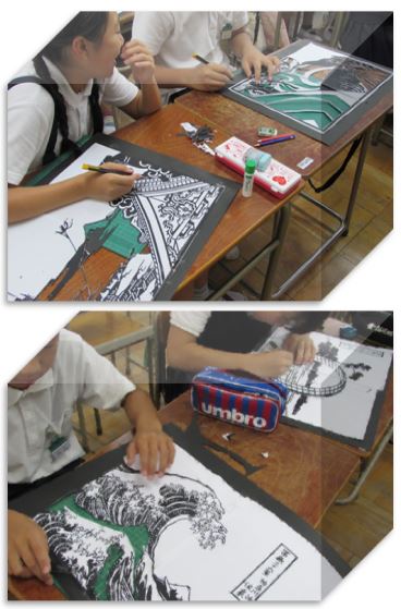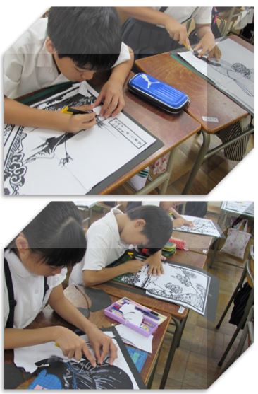 6年生の図画工作の学習です。カッターナイフを使って、切り絵に取り組んでいます。細かい作業ですが、集中して取り組んでいます。