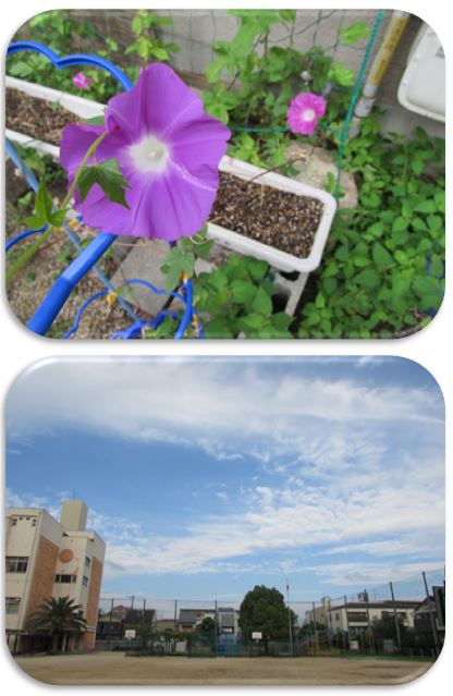 1年生の教室の外に育てているアサガオの花も、幾分涼しげに感じられます。空に浮かぶ雲も、秋の様相です。