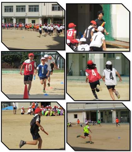 5年生は、運動場でリレーの練習を行っています。全力で駆ける友達に、仲間の声援が飛んでいます。
