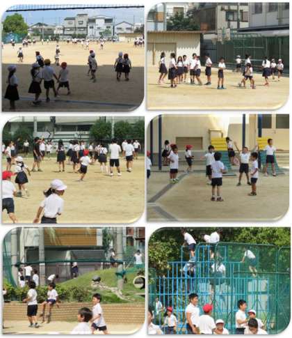 休み時間、子どもたちが運動場に出てきました。元気いっぱい、楽しく遊んでいます。