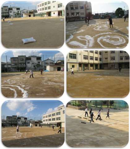 来週以降、子どもたちが砂ぼこりのないグランドで、気持ちよく練習に取り組めるよう、職員でにがりを撒きました。