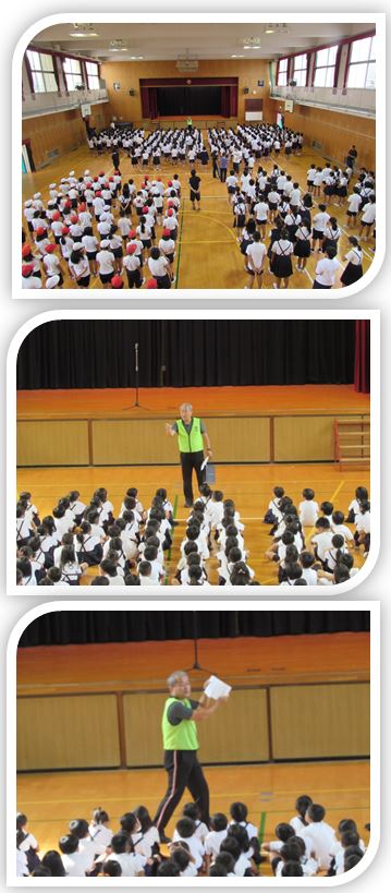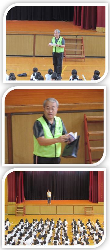 初めに、学校長の話です。芝生の手入れに地域の方が来られていたり、校内の植樹の剪定作業を、成南校園営繕園芸事務所の園芸班の方々が行っていること、そういった方々にお会いしたら「こんにちは」「ありがとうございます」と挨拶をしましょう、という話、夏休みの歯みがきカレンダーの集計結果から、毎日朝晩しっかりと歯みがきをしましょう、という話、ご近所の方からいただいた、千本小学校の子どもへのお褒めの手紙の話がありました。楽しい本の紹介では、「ペット」を紹介しました。