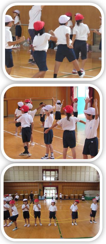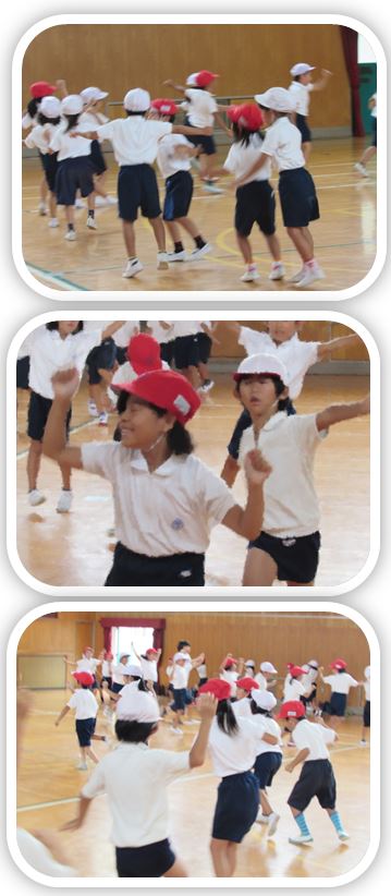 1年生は体育館で団体演技の練習です。隊形移動も含めて最後まで通して踊りました。元気に声も出ています。