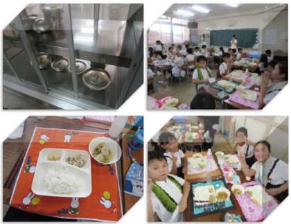 本日の給食の献立をご紹介します。本日の献立は、ご飯、鶏肉と里芋の煮物、豚肉とキャベツの生姜炒め、みたらしだんご、牛乳でした。